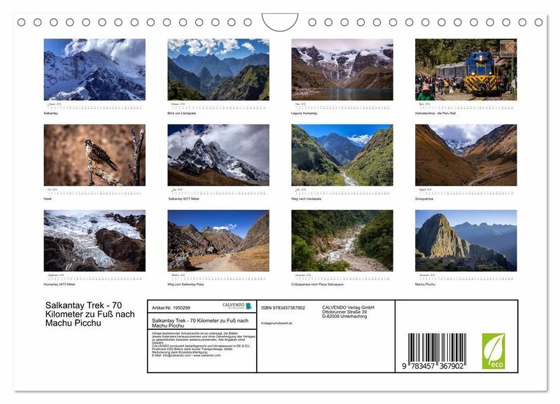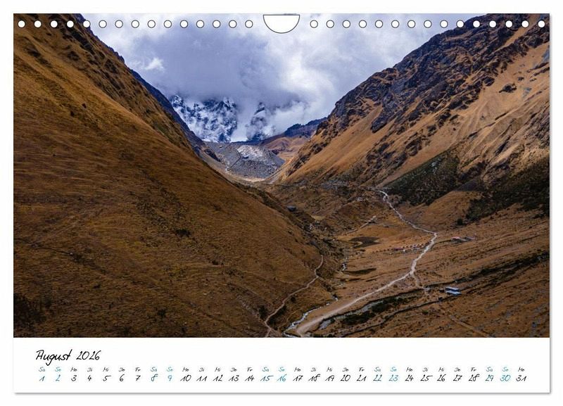 Von den schneebedeckten Gipfeln des Salkantay-Massivs über die grünen Täler und beeindruckenden Wasserfälle bis hin zu den historischen Ruinen des Machu Picchu - dieser Kalender entführt dich auf eine visuelle Reise durch eine der spektakulärsten Trekkingrouten der Welt.