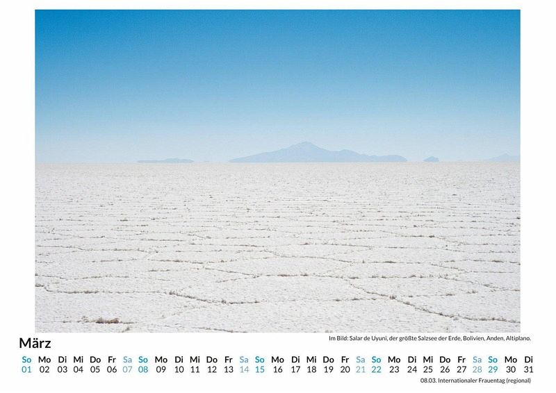 Tauchen Sie ein in die faszinierende Welt der Salzseen! Dieser hochwertige Wandkalender entführt Sie Monat für Monat zu atemberaubenden Landschaften, die durch ihre surrealen Farben und Formen verzaubern. Jedes der 12 sorgfältig ausgewählten Motive wurde auf lichtbeständigem Bilderdruckpapier gedruckt, um Ihnen das ganze Jahr über brillante Farben zu garantieren. Hergestellt in Deutschland auf FSC-zertifiziertem Papier, vereint dieser Kalender Nachhaltigkeit und Ästhetik. Perfekt für Naturliebhaber und alle, die sich von der Schönheit der Natur inspirieren lassen möchten. Holen Sie sich jetzt ein Stück Magie in Ihr Zuhause! Hochwertig Erleben Sie ein Jahr voller Eleganz mit unserem Premium-Fotokalender. Jedes der 12 Motive ist auf hochwertigem, lichtbeständigem Bilderdruckpapier gedruckt, um die Lebendigkeit jedes Bildes zu bewahren. Die robuste Spiralbindung gewährleistet Langlebigkeit und einfache Handhabung. Nachhaltig Unser Engagement für die Umwelt spiegelt sich in jedem Exemplar wider. Durch die Produktion auf Abruf reduzieren wir signifikant unseren Abfall. Wir verwenden ausschließlich umweltfreundliches, FSC-zertifiziertes Papier. Stolz gefertigt in Deutschland, achten wir bei unserer Logistik auf Klimaschutz, um unseren ökologischen Fußabdruck zu minimieren. Das ideale Geschenk Dieser Kalender ist das perfekte Präsent für jeden Anlass - ob Weihnachten, Geburtstage oder einfach als liebevolle Aufmerksamkeit zwischendurch. Geeignet für Freunde, Familie, Kinder und Erwachsene gleichermaßen, bereichert er jedes Zuhause mit seiner Vielfalt und Schönheit, unabhängig vom Alter der Beschenkten.
