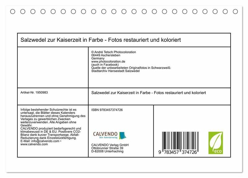 QUALITÄT - Hochwertiger Fotokalender mit 12 wunderschönen Motiven auf lichtbeständigem Bilderdruckpapier, robuste Spiralbindung.NACHHALTIG - deutliche Abfallreduzierung durch bedarfsgerechte Einzelstückfertigung, umweltfreundliches FSC-zertifiziertes Papier, Produktion in Deutschland, klimabewusste Logistik.PERFEKTES GESCHENK - Kalender für Freunde und Familie, für Kinder und Erwachsene, jung und alt, zu Weihnachten, Geburtstag oder zwischendurch.VIELFALT - Bildkalender in verschiedenen Formaten, z.B. DIN A5, DIN A4, DIN A3 sowie DIN A2. Ob Naturmotiv, Gemälde oder Fotos, ideal für ein persönliches Wohlfühlambiente.Der Alltag der schönen Hansestadt Salzwedel um das Jahr 1900 zur Kaiserzeit erwacht in lebendigen Farben zu neuem Leben. von Autor(in): André Tetsch