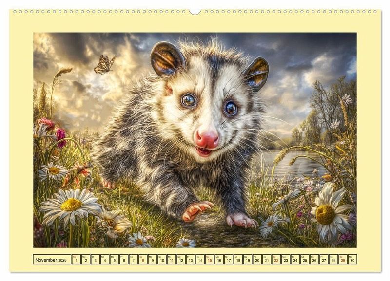 Dieser Kalender widmet sich besonders geheimnisvollen Geschöpfen. Den Opossums. In kunstvoll erzeugten Illustrationen verschmelzen Naturhintergründe zu tollen Momentaufnahmen. Jedes Bild wurde mit der Hilfe von KI erstellt und erzählt eine Geschichte, von Fürsorge und Neugier bis zur Geborgenheit. So entstand ein Jahreslauf, der die Schönheit und Würde dieser faszinierenden Tiere zeigt.