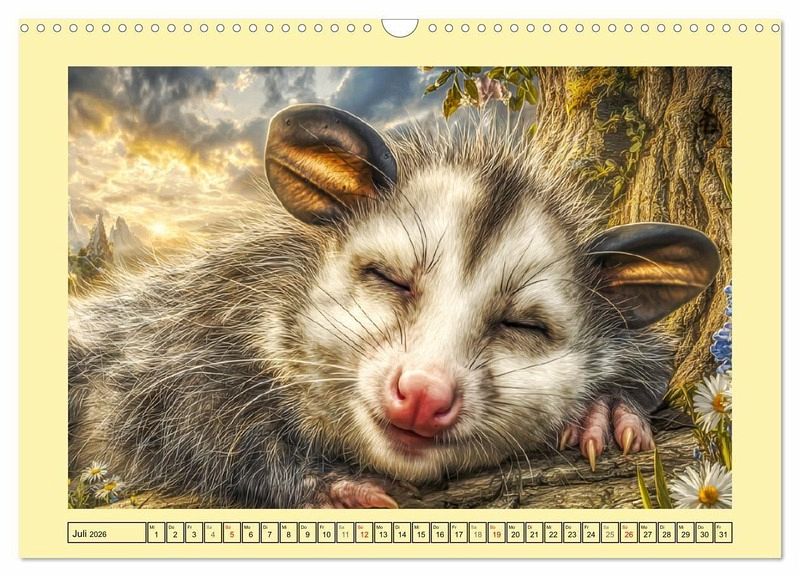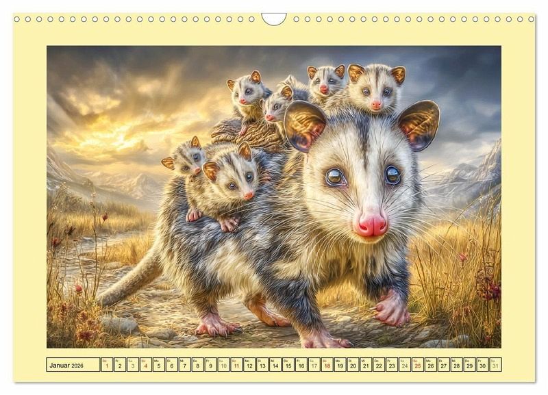 Dieser Kalender widmet sich besonders geheimnisvollen Geschöpfen. Den Opossums. In kunstvoll erzeugten Illustrationen verschmelzen Naturhintergründe zu tollen Momentaufnahmen. Jedes Bild wurde mit der Hilfe von KI erstellt und erzählt eine Geschichte, von Fürsorge und Neugier bis zur Geborgenheit. So entstand ein Jahreslauf, der die Schönheit und Würde dieser faszinierenden Tiere zeigt.