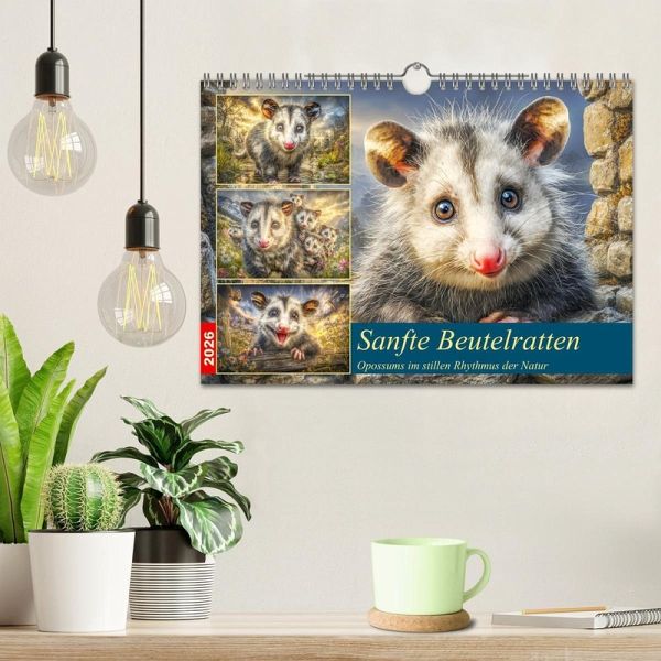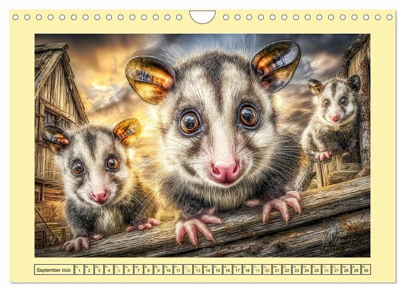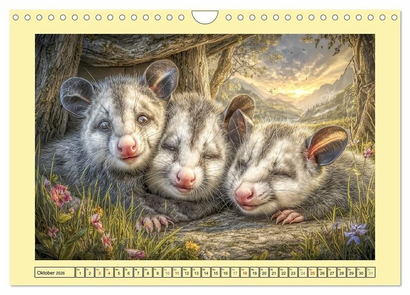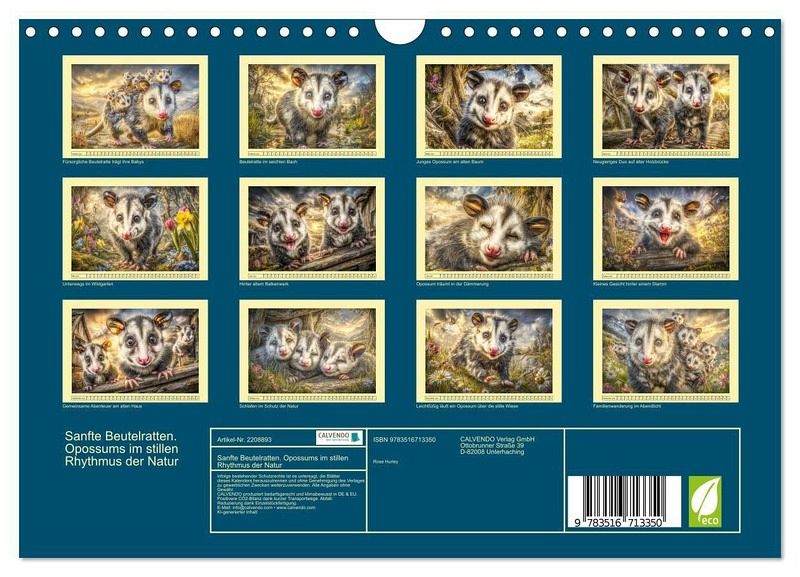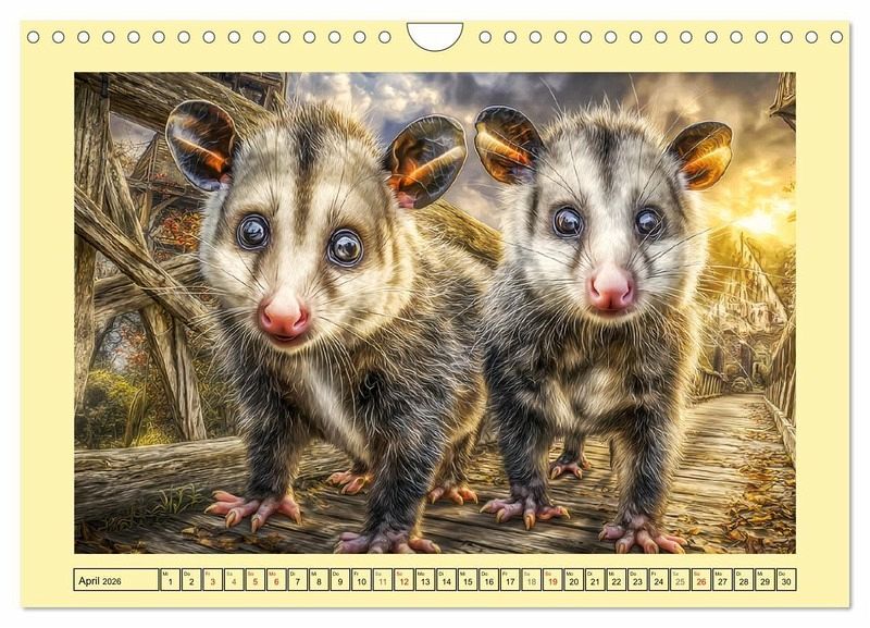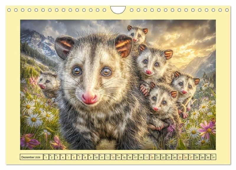 Dieser Kalender widmet sich besonders geheimnisvollen Geschöpfen. Den Opossums. In kunstvoll erzeugten Illustrationen verschmelzen Naturhintergründe zu tollen Momentaufnahmen. Jedes Bild wurde mit der Hilfe von KI erstellt und erzählt eine Geschichte, von Fürsorge und Neugier bis zur Geborgenheit. So entstand ein Jahreslauf, der die Schönheit und Würde dieser faszinierenden Tiere zeigt.