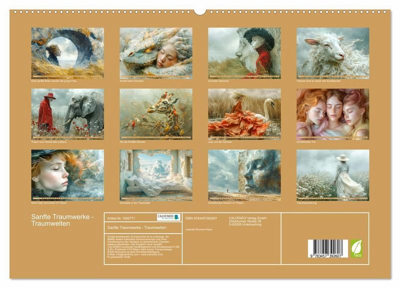 Dieser Kalender präsentiert eine faszinierende Sammlung von sanften Traumwerken, die mithilfe der neuesten KI generiert wurden. Tauchen Sie ein in surreale und verträumte Szenen, wie einer Giraffe, die von kleinen Vögeln träumt, einer Frau in einem eleganten roten Kleid auf einem majestätischen Schwan, schlafender Mädchen in pastellfarbenen Tüchern oder eine Asiatin, die von einem Drachen sanft eingerollt liegend ist. Dieses Thema Traum ist für alle Freunde von surrealen und verträumten Welten gewidmet. Lassen Sie sich von der Fantasie und Tiefe dieser einzigartigen Kalenderbilder verzaubern.