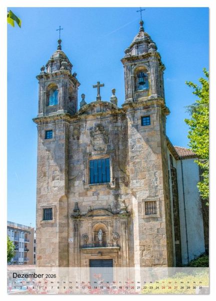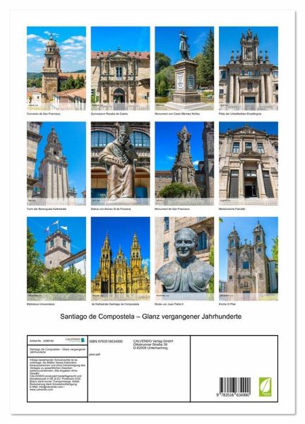 Ein kunstvoll gestalteter Kalender, der die eindrucksvollsten Bauwerke und versteckten architektonischen Schätze von Santiago de Compostela in zwölf stimmungsvollen Monatsmotiven zeigt. Jeder Monat lädt dazu ein, die faszinierende Mischung aus Geschichte, Kultur und einzigartiger Architektur dieser bedeutenden Pilgerstadt neu zu entdecken.