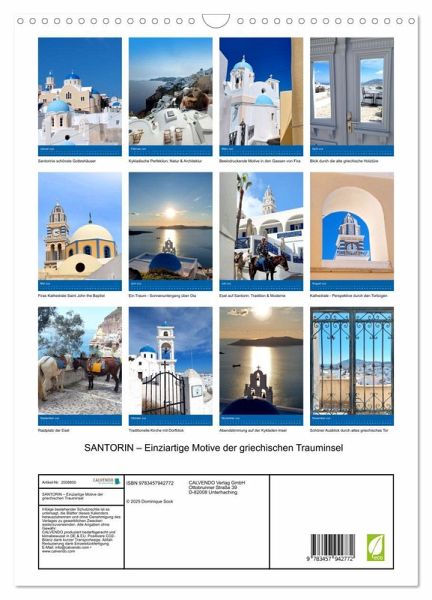 Tauchen Sie ein in die einzigartige, magische und atemberaubende Welt Santorins! Dieser exklusive Fotokalender fängt das Juwel der Ägäis in seiner ganzen Schönheit ein - von faszinierenden spektakulären Perspektiven über atemberaubende Ausblicke bis hin zu den ikonischen weißen Häusern mit blauen Kuppeln.