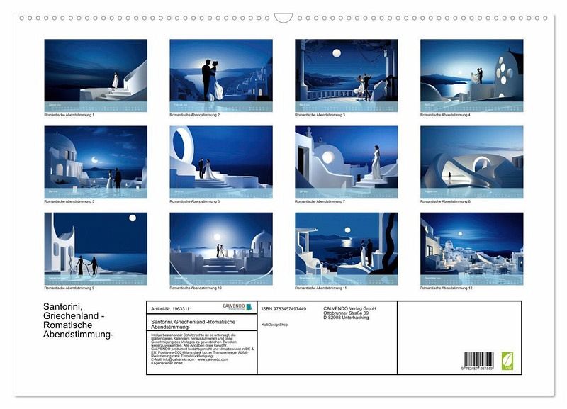 Erleben Sie das ganze Jahr über die romantische Pracht von Santorini mit unserem traumhaften Wandkalender. Verlieben Sie sich jeden Monat aufs Neue in die atemberaubende Schönheit der Insel, während der sanfte Mond über dem azurblauen Meer scheint. Perfekt für Griechenlandliebhaber und als Geschenk für besondere Anlässe wie Hochzeiten oder Hochzeitsreisen. Tauchen Sie ein in die magische Welt von Santorini!