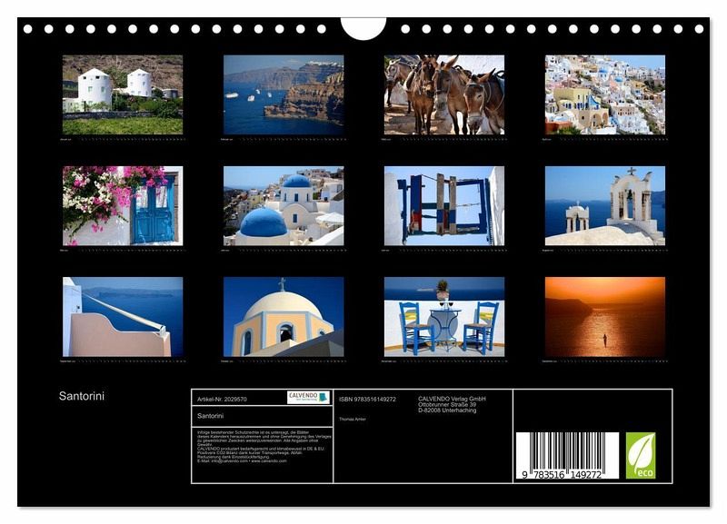Träumen sie von einer Insel mit außergewöhnlichem Flair, von schneeweiß blitzenden Häusern mit blauen Kuppeldächern, von Orten mit engen Gassen und verwinkelten Häusern, von einem einmaligen Sonnenuntergang am Kraterrand? Die Bilder dieses Kalenders bringen Ihnen Ihren Traum etwas näher und sind ein kleiner Ausschnitt von beeindruckenden Impressionen auf Santorini. Ein passendes Geschenk für alle Santorini Liebhaber.