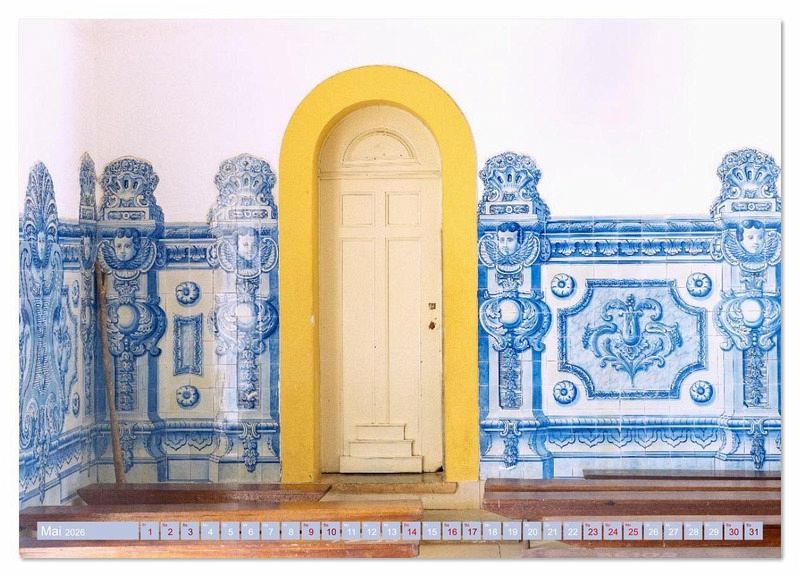 Mai: Innenraum der Kathedrale Nossa Senhora da Graça mit blau-weißem Azuleijo-Fries und gelber Tür in Sao Tome