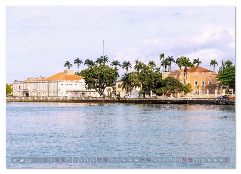 Januar: Oberstes Gericht und Präsidentenpalast an der Ana Chavez Bay in Sao Tome