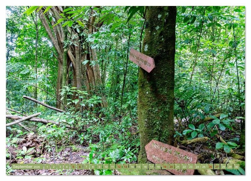 September: Wanderweg und Wegweiser zum Kratersee Lagoa Amelia und Pico São Tome im primären Regenwald des Obo Natural Park