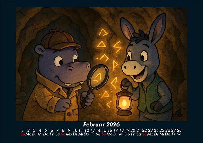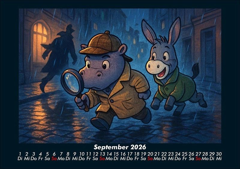 Sashito & Huf - Geheimnisvolle Mission 2026 Motivkalender DIN A5 Begleite Sashito, das clevere junge Nilpferd im Detektivmantel, und Huf, den freundlichen Esel mit seinem warmen Lächeln, auf einer geheimnisvollen Mission durch das Jahr. In jedem Monat begeben sie sich in neue, spannende Szenen voller Rätsel, Abenteuer und mystischer Stimmungen. Von nächtlichen Ermittlungen unter Sternenhimmel bis zu geheimnisvollen Reisen in alte Ruinen - dieser Kalender erzählt die fesselnde Geschichte zweier Freunde, die Mut, Neugier und Zusammenhalt vereinen. Perfekt für alle, die Abenteuer, Geheimnisse und liebenswerte tierische Charaktere lieben. Vero-Kalender Kids zeigen liebevoll gestaltete Monatskalender mit bunten Bild-Motiven tierischer Freunde, die gemeinsam spannende Abenteuer erleben und die Welt entdecken. Ob in fernen Ländern, zwischen berühmten Sehenswürdigkeiten oder in magischen Landschaften - die fröhlichen Tiercharaktere begleiten Kinder Monat für Monat durch ein Jahr voller Fantasie, Freude und Freundschaft. Gedruckt werden die Kinder-Kalender aus dem Vero Verlag auf hochwertigem Kalenderbogen in Premium-Qualität und in verschiedenen Größen.