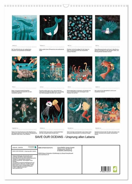 Unser wunderschöner Planet Erde mit all seinen kleinen und grossen Bewohnern über und unter dem Wasser liegen der Illustratorin, Danja Krampikowski (www.wachtraum.ch), sehr am Herzen. Die 12 liebevoll gezeichneten Bilder mit herzigen Meerestieren, Fabelwesen und hübschen Unterwasserillustrationen bringen jeden Meeresliebhaber zum Träumen. Eine tolle Geschenkidee für Menschen, die Kunst, Tiere, Pflanzen und unsere Meere lieben. Wollen wir die Welt gemeinsam ein bisschen schöner machen? Dieser qualitativ hochwertige Kalender gehört zur exklusiven CALVENDO Gold-Edition.