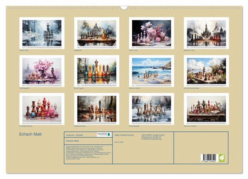 Erleben Sie die Schönheit des Schachs auf eine ganz neue Art und Weise mit unserem Kalender mit KI-generierten Aquarellen. Jeder Monat zeigt ein einzigartiges Brettspiel mit ungewöhnlichen Mustern und Schachfiguren in jahreszeitlich angepasster Umgebung. Die Aquarelle sind von hoher Qualität und beeindruckender Komplexität und werden von einer künstlichen Intelligenz erstellt. Das Ergebnis ist eine surreale und futuristische Kunst, die das Schachspiel aus einem neuen Blickwinkel betrachtet. Der Kalender ist ein perfektes Geschenk für jeden Schachliebhaber oder Kunstliebhaber.