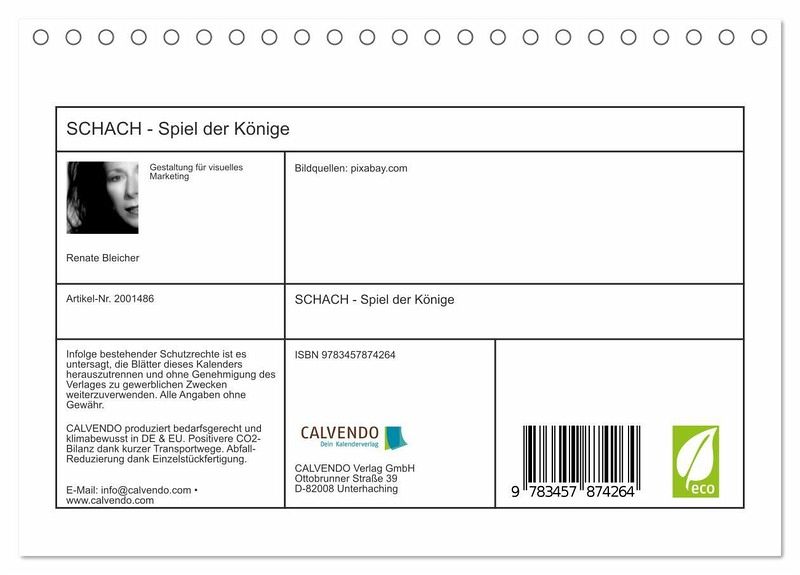 QUALITÄT - Hochwertiger Fotokalender mit 12 wunderschönen Motiven auf lichtbeständigem Bilderdruckpapier, robuste Spiralbindung.NACHHALTIG - deutliche Abfallreduzierung durch bedarfsgerechte Einzelstückfertigung, umweltfreundliches FSC-zertifiziertes Papier, Produktion in Deutschland, klimabewusste Logistik.PERFEKTES GESCHENK - Kalender für Freunde und Familie, für Kinder und Erwachsene, jung und alt, zu Weihnachten, Geburtstag oder zwischendurch.VIELFALT - Bildkalender in verschiedenen Formaten, z.B. DIN A5, DIN A4, DIN A3 sowie DIN A2. Ob Naturmotiv, Gemälde oder Fotos, ideal für ein persönliches Wohlfühlambiente.Fantastische Bilder aus der Welt des Schachs von Autor(in): Renate Bleicher