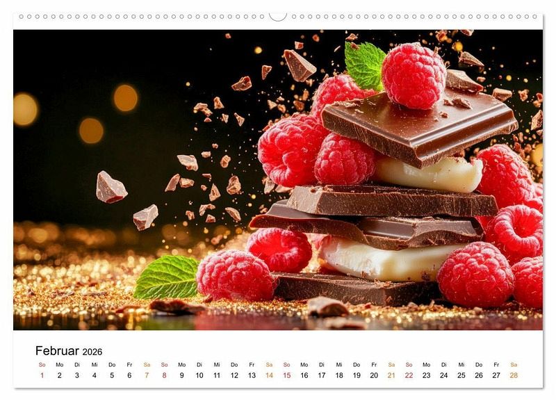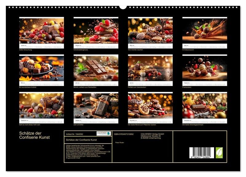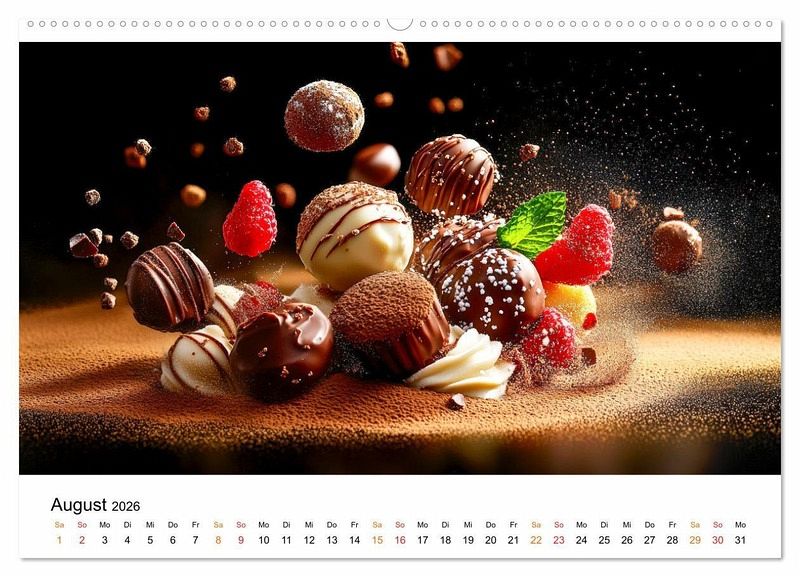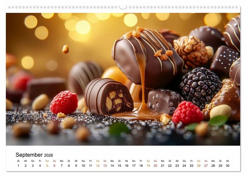 Tauchen Sie ein in die verführerische Welt von Pralinen und Schokolade, die in köstlichen Motiven perfekt in Szene gesetzt werden. Jedes KI-Bild zeigt liebevoll arrangierte Schokoladenkreationen, die so appetitlich aussehen, dass man sie am liebsten direkt probieren möchte. Genießen Sie jeden Monat den Anblick von zarten Pralinen, feiner Schokolade oder süßen Keksen - ob klassisch, mit Nüssen, edlen Gewürzen oder frischen Früchten verfeinert. Perfekt als Geschenk für Freunde, Familie oder einfach für Sie selbst - dieser Kalender lässt Sie Monat für Monat in die Welt der Schokolade eintauchen und ist ein täglicher Genuss für die Sinne.