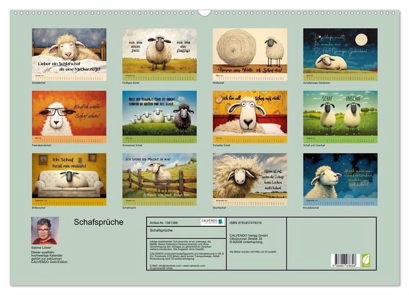 QUALITÄT - Hochwertiger Fotokalender mit 12 wunderschönen Motiven auf lichtbeständigem Bilderdruckpapier, robuste Spiralbindung mit Aufhängebügel.NACHHALTIG - deutliche Abfallreduzierung durch bedarfsgerechte Einzelstückfertigung, umweltfreundliches FSC-zertifiziertes Papier, Produktion in Deutschland, klimabewusste Logistik.PERFEKTES GESCHENK - Kalender für Freunde und Familie, für Kinder und Erwachsene, jung und alt, zu Weihnachten, Geburtstag oder zwischendurch.VIELFALT - Bildkalender in verschiedenen Formaten, z.B. DIN A5, DIN A4, DIN A3 sowie DIN A2. Ob Naturmotiv, Gemälde oder Fotos, ideal für ein persönliches Wohlfühlambiente.Coole Sprüche rund ums Schaf mit passenden Bildern von Autor(in): Sabine Löwer