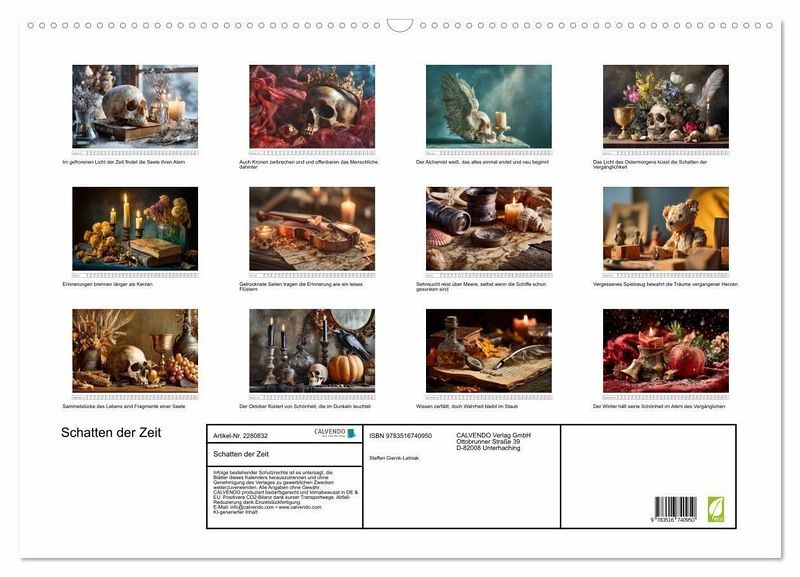 In jeder Stunde liegt ein Geheimnis. In jedem Objekt ein Stück Vergangenheit. Dieser Kalender lädt ein zu einer Reise in die Stille, wo Kerzen flackern, Uhren schweigen und alte Dinge ihre Geschichten offenbaren. Ein Jahr voller Sinnbilder, voller Emotion, voller Staunen. Ein Kalender, der nicht nur Räume schmückt, sondern Herzen berührt. Alle hier gezeigten Bilder wurden mit Sorgfalt, Liebe und mit Hilfe einer KI generiert. Abschließend werden sie mit Bildbearbeitungsprogrammen überarbeitet und in den Kalender eingefügt.
