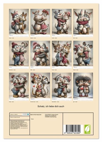 QUALITÄT - Hochwertiger Fotokalender mit 12 wunderschönen Motiven auf lichtbeständigem Bilderdruckpapier, robuste Spiralbindung mit Aufhängebügel.NACHHALTIG - deutliche Abfallreduzierung durch bedarfsgerechte Einzelstückfertigung, umweltfreundliches FSC-zertifiziertes Papier, Produktion in Deutschland, klimabewusste Logistik.PERFEKTES GESCHENK - Kalender für Freunde und Familie, für Kinder und Erwachsene, jung und alt, zu Weihnachten, Geburtstag oder zwischendurch.VIELFALT - Bildkalender in verschiedenen Formaten, z.B. DIN A5, DIN A4, DIN A3 sowie DIN A2. Ob Naturmotiv, Gemälde oder Fotos, ideal für ein persönliches Wohlfühlambiente.Liebevoll illustrierte Tierpaare mit menschlichen Zügen. von Autor(in): Roder
