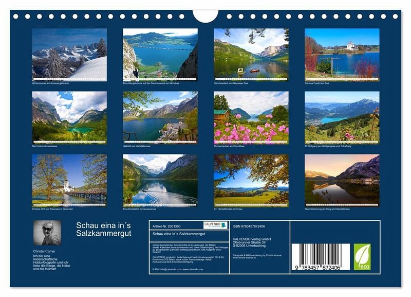 QUALITÄT - Hochwertiger Fotokalender mit 12 wunderschönen Motiven auf lichtbeständigem Bilderdruckpapier, robuste Spiralbindung mit Aufhängebügel.NACHHALTIG - deutliche Abfallreduzierung durch bedarfsgerechte Einzelstückfertigung, umweltfreundliches FSC-zertifiziertes Papier, Produktion in Deutschland, klimabewusste Logistik.PERFEKTES GESCHENK - Kalender für Freunde und Familie, für Kinder und Erwachsene, jung und alt, zu Weihnachten, Geburtstag oder zwischendurch.VIELFALT - Bildkalender in verschiedenen Formaten, z.B. DIN A5, DIN A4, DIN A3 sowie DIN A2. Ob Naturmotiv, Gemälde oder Fotos, ideal für ein persönliches Wohlfühlambiente.Impressionen vom schönen Salzkammergut in Oberösterreich, Steiermark und Salzburg von Autor(in): Christa Kramer