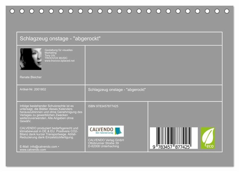 FSC-zertifiziertes Papier, Produktion in Deutschland, klimabewusste Logistik.PERFEKTES GESCHENK - Kalender für Freunde und Familie, für Kinder und Erwachsene, jung und alt, zu Weihnachten, Geburtstag oder zwischendurch.VIELFALT - Bildkalender in verschiedenen Formaten, z.B. DIN A5, DIN A4, DIN A3 sowie DIN A2. Ob Naturmotiv, Gemälde oder Fotos, ideal für ein persönliches Wohlfühlambiente.Faszinierende Konzertaufnahmen von Schlagzeugen aus verschiedenen Perspektiven von Autor(in): Renate Bleicher