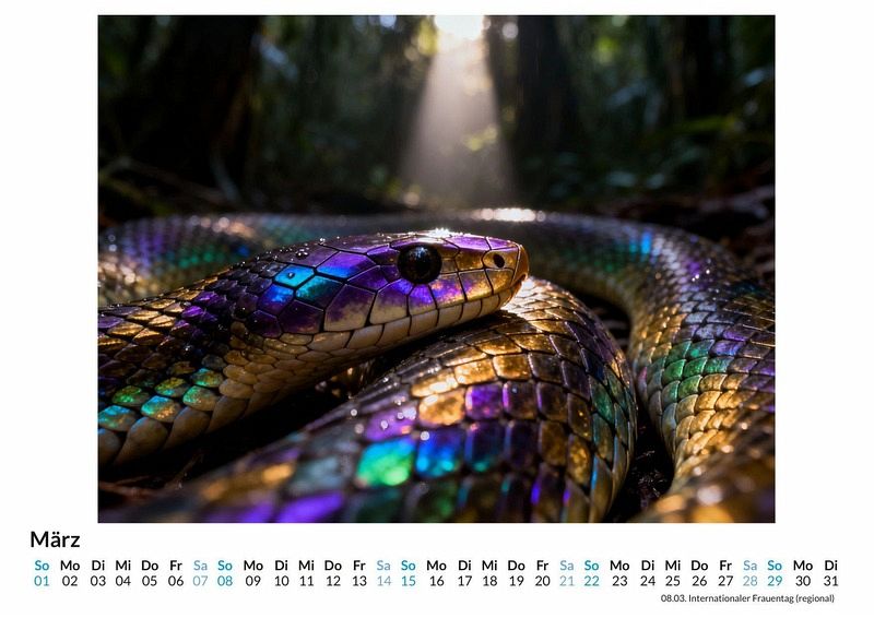 Seit jeher fasziniert die Schlange die Menschheit. Sie ist Symbol für Verführung und Gefahr, für Heilung und ewige Erneuerung. In Mythen und Legenden auf der ganzen Welt spielt sie eine zentrale Rolle, oft gefürchtet, manchmal verehrt, aber selten wirklich verstanden. Dieser Kalender nähert sich dem Wesen der Schlange auf eine neue Art und Weise. Der Kalender ist eine passende Wahl: * Für Liebhaber von Reptilien und ihrer stillen Anmut. * Für Menschen, die sich für Mythologie und die tiefere Symbolik der Schlange interessieren. * Für alle, die eine außergewöhnliche und stilvolle Wanddekoration suchen. Der Kalender "Schlange" widmet sich diesen faszinierenden Wesen und ihrer vielschichtigen Natur. Monat für Monat werden verschiedene Schlangenarten in Szenen gezeigt, die ihre elegante und mystische Seite betonen. Die Motive sind das Ergebnis eines kreativen Prozesses, bei dem digitale Impulse und textliche Vorgaben zu neuen visuellen Welten zusammengefügt wurden. So entsteht eine einzigartige Hommage an ein oft missverstandenes Tier. Was der Kalender bietet: * Zwölf Monatsmotive, die die Schönheit von Schlangen einfangen. * Ein übersichtliches Kalendarium für die Planung des Jahres. * Ein dekoratives Element für jeden Raum. Dieser Kalender ist eine Einladung, die Perspektive zu wechseln und die Schlange in ihrer komplexen Schönheit neu zu entdecken. Er begleitet durch das Jahr mit Bildern, die zum Nachdenken anregen und die Wände schmücken. Ein Blick auf die Monatsansichten lohnt sich, um die Vielfalt der Darstellungen zu erfassen.