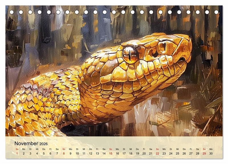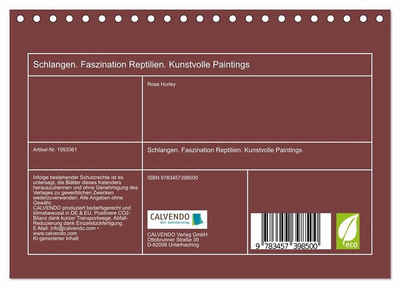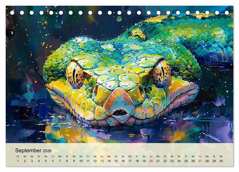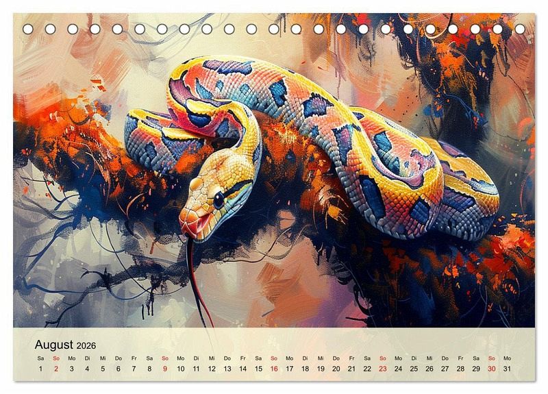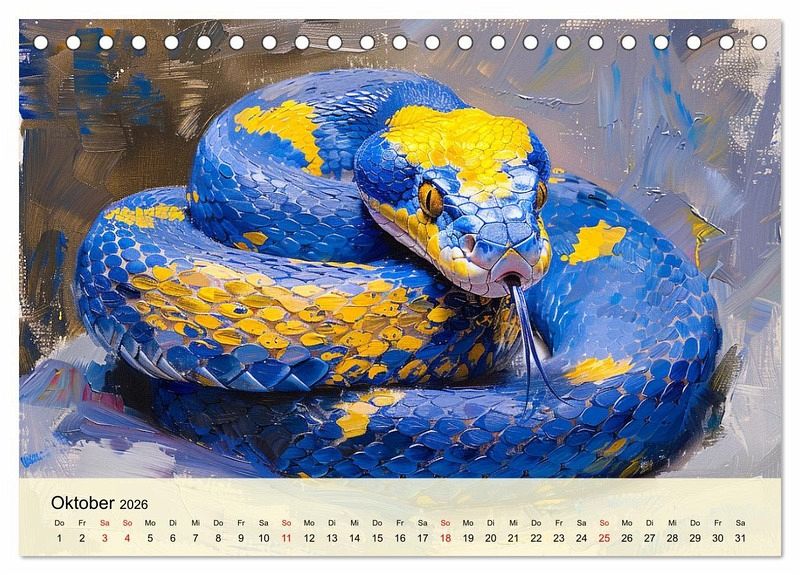 Dieser Schlangenkalender ist ein Kunstprojekt, welches das faszinierende Wesen von Schlangen in zwölf beeindruckenden Ölgemälde-Darstellungen einfängt. Jeder Monat wurde mit Hilfe von KI erstellt und präsentiert ein detailreiches Bild einer anderen Schlangenart, das meisterhaft im klassischen Ölgemälde-Stil gestaltet wurde. Die künstlerische Verschmelzung von Natur und Malerei schafft nicht nur einen visuellen Genuss, sondern auch eine tiefere Wertschätzung für die Schönheit und Vielfalt dieser oft missverstandenen Kreaturen. Der Kalender ist das perfekte Geschenk für Kunst- und Schlangenliebhaber gleichermaßen.