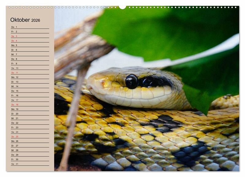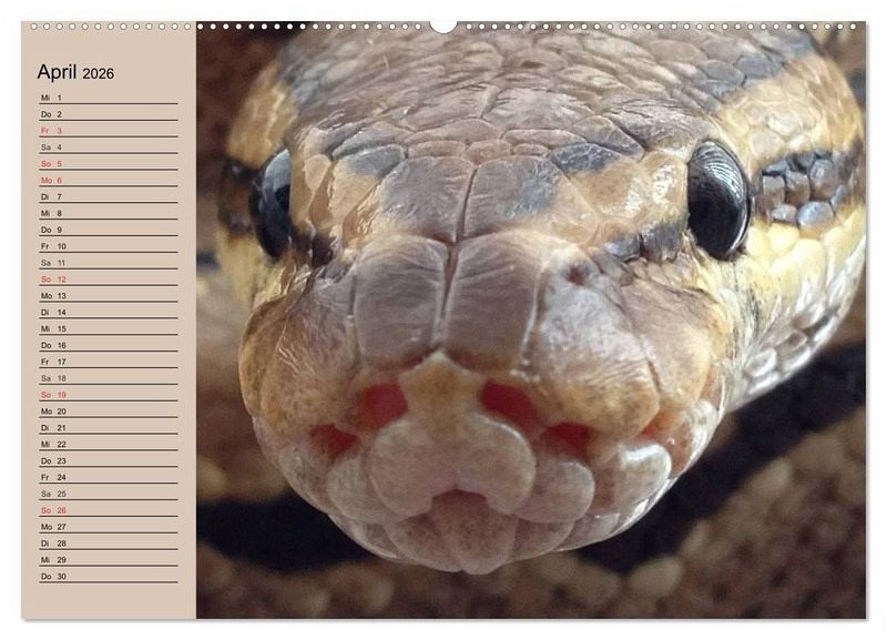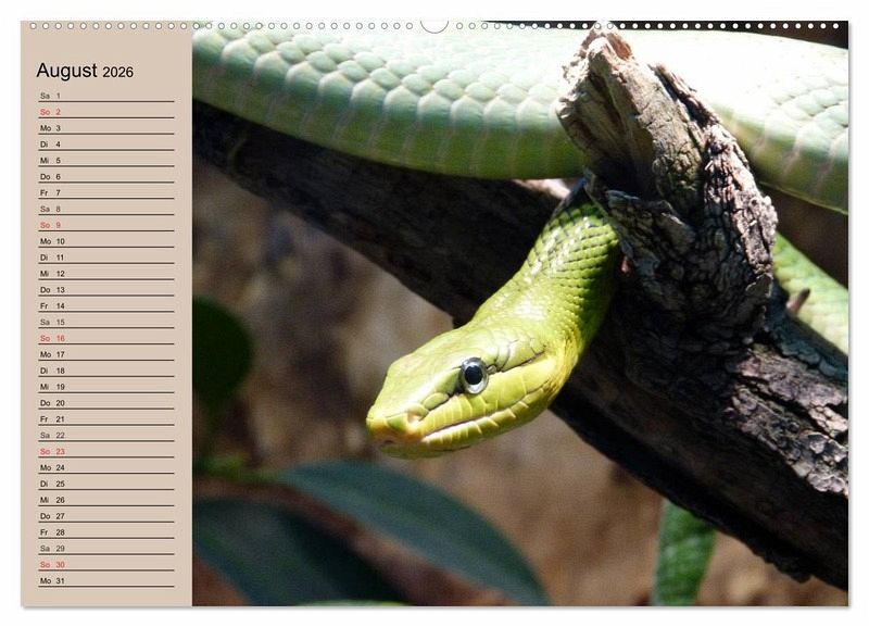 Schlangen sind unglaublich schön gefärbt, aber teilweise auch unglaublich giftig und wie die Riesenschlangen auch sehr stark. Und gerade deshalb faszinieren sie uns wahrscheinlich auch so sehr. Sie leben nicht nur in freier Natur, sondern in tausenden von Wohnzimmern in Terrarien. Ein schöner Planer für Reptilienfreunde.