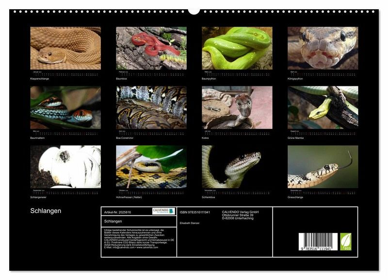 PREMIUM-LINIE - Brillanter Fotokalender mit 12 wunderschönen Motiven, Kunstdruck in Hochglanz in Museumsqualität.QUALITÄT - edle Materialien, stabile Rückwand mit 2 innovativen Einstecktaschen für eine optimale Präsentation an der Wand.NACHHALTIG - deutliche Abfallreduzierung durch bedarfsgerechte Einzelstückfertigung, umweltfreundliches FSC-zertifiziertes Papier, Produktion in Deutschland, klimabewusste Logistik.PERFEKTES GESCHENK - Kalender für Freunde und Familie, für Kinder und Erwachsene, jung und alt, zu Weihnachten, Geburtstag oder zwischendurch.Giftige und ungiftige Schlangen in beeindruckenden Farben von Autor(in): Elisabeth Stanzer