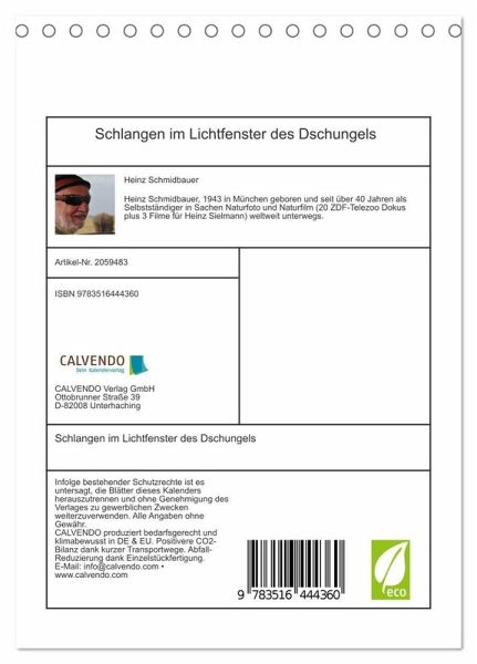 QUALITÄT - Hochwertiger Fotokalender mit 12 wunderschönen Motiven auf lichtbeständigem Bilderdruckpapier, robuste Spiralbindung.NACHHALTIG - deutliche Abfallreduzierung durch bedarfsgerechte Einzelstückfertigung, umweltfreundliches FSC-zertifiziertes Papier, Produktion in Deutschland, klimabewusste Logistik.PERFEKTES GESCHENK - Kalender für Freunde und Familie, für Kinder und Erwachsene, jung und alt, zu Weihnachten, Geburtstag oder zwischendurch.VIELFALT - Bildkalender in verschiedenen Formaten, z.B. DIN A5, DIN A4, DIN A3 sowie DIN A2. Ob Naturmotiv, Gemälde oder Fotos, ideal für ein persönliches Wohlfühlambiente.Schlangen - nur wenige mögen sie, doch faszinierend sind sie dennoch, besonders bei diesen Porträts von Heinz Schmidbauer. von Autor(in): Heinz Schmidbauer