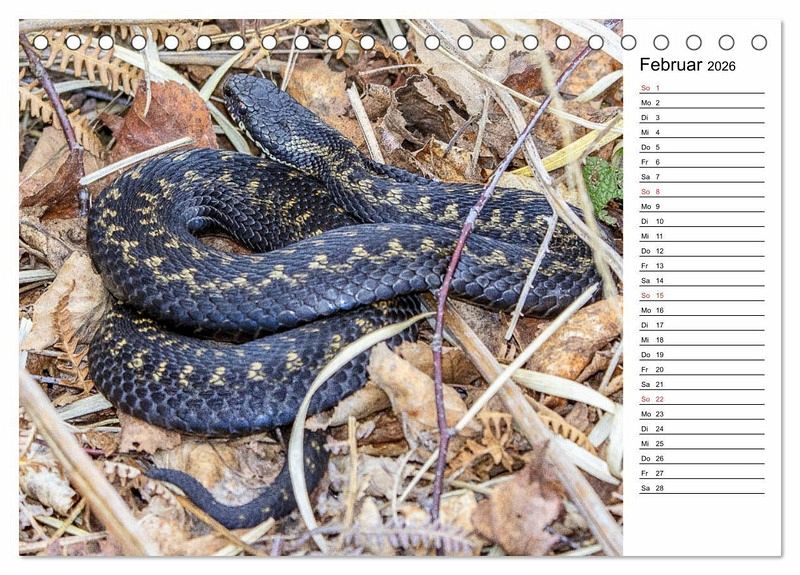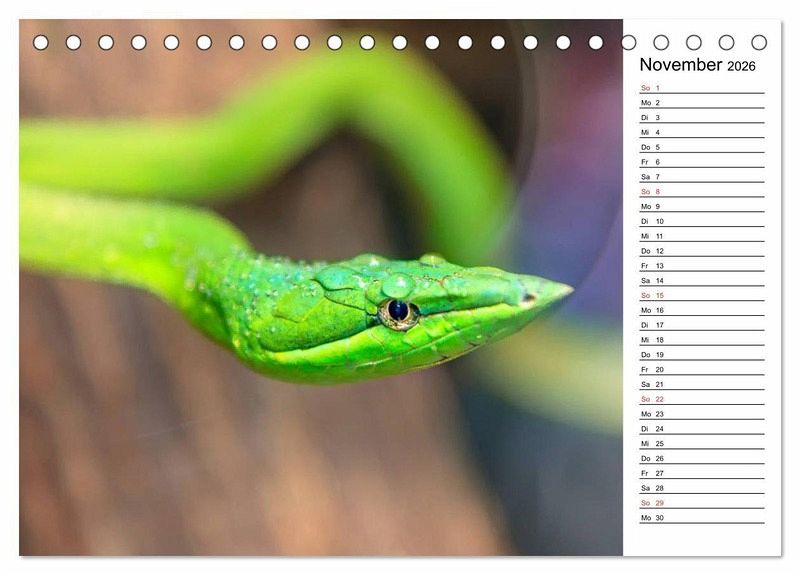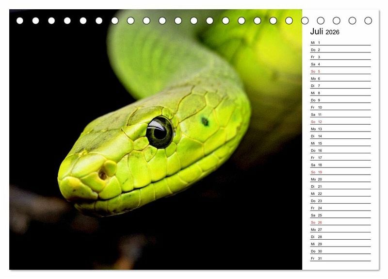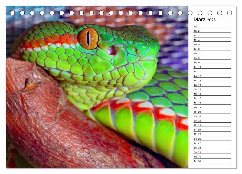 Sie winden und schlängeln sich in den Bäumen oder auf dem Boden und sie werden mit viel Vorsicht betrachtet. Sie sind teilweise giftgrün, braun oder bunt und ihrer Umgebung immer perfekt angepasst. Sie können gefährlich sein und werden weltweit gefürchtet. Nicht ganz zu Unrecht. Jedes Jahr werden nach Schätzung der WHO weltweit rund 2,3 Mio. Menschen von Schlangen gebissen. Ca. 40.000 sterben an den Folgen der Vergiftungen. Man schätzt auf Grund der Dunkelziffer die tatsächliche Anzahl sogar wesentlich höher. Ein schöner Planer für Freunde dieser geheimnisvollen Reptilien.