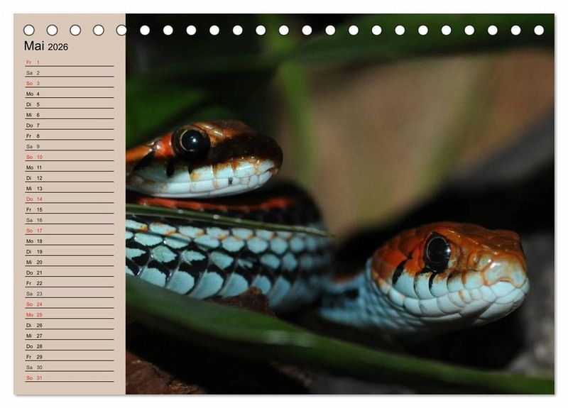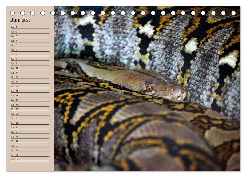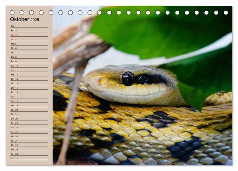 Schlangen sind unglaublich schön gefärbt, aber teilweise auch unglaublich giftig und wie die Riesenschlangen auch sehr stark. Und gerade deshalb faszinieren sie uns wahrscheinlich auch so sehr. Sie leben nicht nur in freier Natur, sondern in tausenden von Wohnzimmern in Terrarien. Ein schöner Planer für Reptilienfreunde.