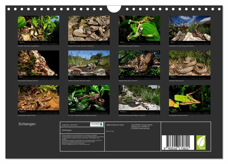 QUALITÄT - Hochwertiger Fotokalender mit 12 wunderschönen Motiven auf lichtbeständigem Bilderdruckpapier, robuste Spiralbindung mit Aufhängebügel.NACHHALTIG - deutliche Abfallreduzierung durch bedarfsgerechte Einzelstückfertigung, umweltfreundliches FSC-zertifiziertes Papier, Produktion in Deutschland, klimabewusste Logistik.PERFEKTES GESCHENK - Kalender für Freunde und Familie, für Kinder und Erwachsene, jung und alt, zu Weihnachten, Geburtstag oder zwischendurch.VIELFALT - Bildkalender in verschiedenen Formaten, z.B. DIN A5, DIN A4, DIN A3 sowie DIN A2. Ob Naturmotiv, Gemälde oder Fotos, ideal für ein persönliches Wohlfühlambiente.Fotokalender mit Motiven von Schlangen aus aller Welt von Autor(in): Benny Trapp