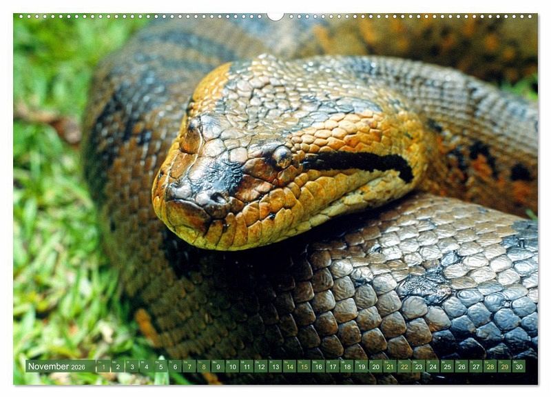 November: Große Anakonda (Eunectes murinus), zählt zu den größten Riesenschlangen der Welt, lebt und jagt an den Flüssen Südamerikas