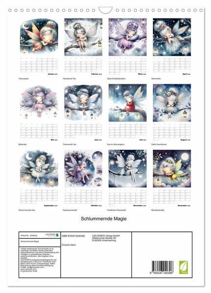 Willkommen in einer Welt voller Magie und Träume mit unserem bezaubernden Kalender. Jeder Monat enthüllt ein wundervolles Bild einer kleinen schlafenden Fee, die in einem Meer aus Sternen, Blüten und magischem Licht ruht. Diese kunstvollen Darstellungen, geschaffen von Künstlicher Intelligenz, fangen die unschuldige Schönheit und den friedlichen Schlummer dieser fantastischen Wesen ein. Lassen Sie sich von der zauberhaften Atmosphäre und der kindlichen Unschuld verzaubern, die in jedem dieser Bilder eingefangen ist.