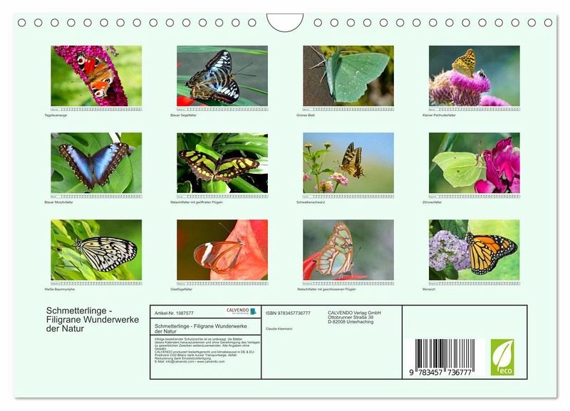 QUALITÄT - Hochwertiger Fotokalender mit 12 wunderschönen Motiven auf lichtbeständigem Bilderdruckpapier, robuste Spiralbindung mit Aufhängebügel.NACHHALTIG - deutliche Abfallreduzierung durch bedarfsgerechte Einzelstückfertigung, umweltfreundliches FSC-zertifiziertes Papier, Produktion in Deutschland, klimabewusste Logistik.PERFEKTES GESCHENK - Kalender für Freunde und Familie, für Kinder und Erwachsene, jung und alt, zu Weihnachten, Geburtstag oder zwischendurch.VIELFALT - Bildkalender in verschiedenen Formaten, z.B. DIN A5, DIN A4, DIN A3 sowie DIN A2. Ob Naturmotiv, Gemälde oder Fotos, ideal für ein persönliches Wohlfühlambiente.Wunderschöne Schmetterlinge sind hier zur Unterstützung ihrer Filigranheit weichgezeichnet. von Autor(in): Claudia Kleemann