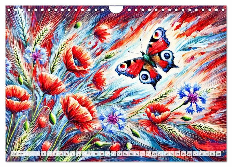Juli: Tagpfauenauge mit Mohnblüten und Kornblumen
