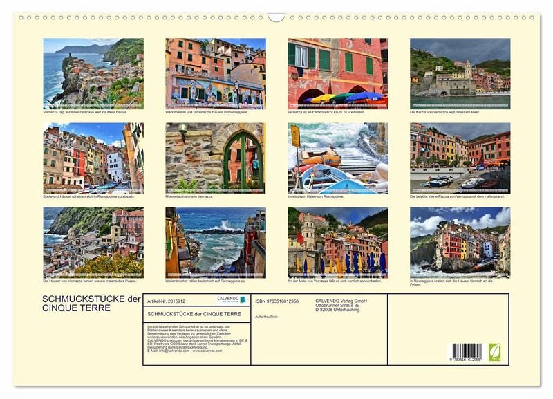Die "Fünf-Länder-Küste" zählt zweifellos zu den schönsten Landstrichen Italiens. Formen und Farben scheinen hier von leichter Hand ins Meer geworfen worden zu sein. Schroffe Klippen im tiefblauen Meer, eine terrassierte Kulturlandschaft und fünf malerische Dörfer ziehen jeden Besucher in ihren Bann. 13 stimmungsvolle Aufnahmen portraitieren die Orte Vernazza und Riomaggiore.