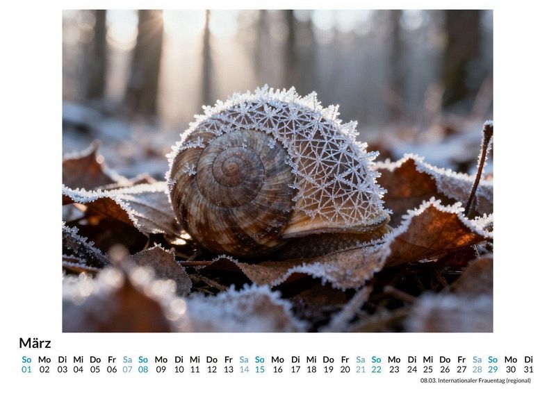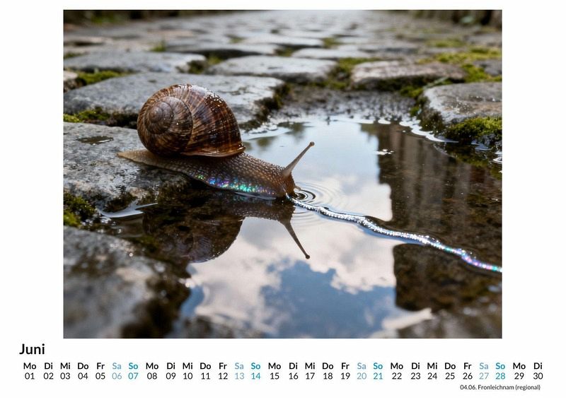 Hektik prägt oft den Alltag, doch in der Natur existiert ein faszinierender Gegenentwurf. Ein Lebewesen, das uns lehrt, innezuhalten und den Moment wertzuschätzen. Der Kalender "Schnecke" widmet sich diesem Symbol der Langsamkeit und des Rückzugs in das eigene Zuhause. Dieser Kalender ist eine gute Wahl: * Für Liebhaber der Makrofotografie und der kleinen Wunder der Natur. * Für Menschen, die einen Ruhepol in ihrem schnelllebigen Alltag suchen. * Für alle, die eine besondere und symbolträchtige Wanddekoration schätzen. Monat für Monat entfaltet sich die Welt der Schnecken in detailreichen Aufnahmen. Die spiralenförmigen Häuser, die zarten Fühler und die glänzenden Spuren werden zu Kunstwerken. Jedes Monatsblatt zeigt eine Komposition, die aus der Synthese unzähliger Datenpunkte und kreativer Algorithmen entstanden ist und die Schönheit dieser Tiere auf eine neue Weise interpretiert. Die Motive laden dazu ein, die Perspektive zu wechseln und die Perfektion im Kleinen zu erkennen. Beim Kauf dieses Kalenders kann man Folgendes erwarten: * Zwölf Monatsmotive, die die Schnecke in den Fokus rücken. * Ein praktisches Kalendarium für die Organisation des Jahres. * Ein Begleiter, der monatlich an die Wichtigkeit von Geduld erinnert. Dieser Kalender ist mehr als nur ein Zeitplaner. Er ist eine tägliche Erinnerung daran, das eigene Tempo zu finden und die Geborgenheit des eigenen Heims zu genießen. Ein ganzes Jahr im Zeichen der Entschleunigung wartet. Es lohnt sich, einen Blick auf die einzelnen Monatsblätter zu werfen.