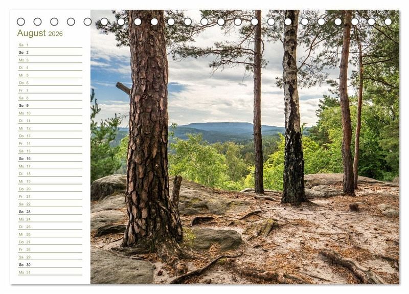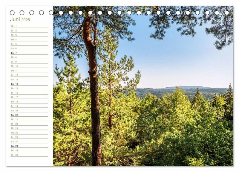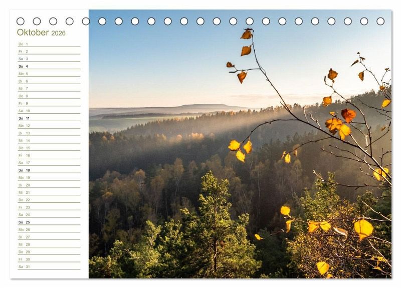 Der Hohe Schneeberg fällt auf. Kein Wunder, denn der Gipfel des Decínský Snezník ist mit 723 Metern die höchste Erhebung des Elbsandsteingebirges, seine Silhouette mitsamt Aussichtsturm unverkennbar. Alle Aufnahmen sind von sächsischer Seite aus entstanden, der Tafelberg selbst befindet sich in der Böhmischen Schweiz. Der Kalender ist sozusagen ein grenzübergreifendes Projekt. Viel Freude damit!