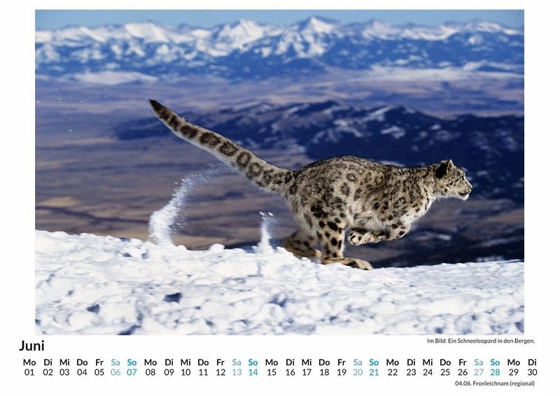 Entdecken Sie die majestätische Schönheit des Schneeleoparden mit unserem exklusiven Monats-Wandkalender! Tauchen Sie Monat für Monat in die faszinierende Welt dieser seltenen Großkatze ein - festgehalten in 12 atemberaubenden Motiven, die auf hochwertigem, lichtbeständigem Bilderdruckpapier erstrahlen. Gedruckt in Deutschland auf FSC-zertifiziertem Papier, vereint dieser Kalender Nachhaltigkeit und beeindruckende Naturfotografie. Perfekt für Tierliebhaber und Naturliebhaber, die sich das ganze Jahr über von der Eleganz des Schneeleoparden inspirieren lassen möchten. Holen Sie sich jetzt ein Stück Wildnis in Ihr Zuhause - ideal auch als Geschenk! Hochwertig Erleben Sie ein Jahr voller Eleganz mit unserem Premium-Fotokalender. Jedes der 12 Motive ist auf hochwertigem, lichtbeständigem Bilderdruckpapier gedruckt, um die Lebendigkeit jedes Bildes zu bewahren. Die robuste Spiralbindung gewährleistet Langlebigkeit und einfache Handhabung. Nachhaltig Unser Engagement für die Umwelt spiegelt sich in jedem Exemplar wider. Durch die Produktion auf Abruf reduzieren wir signifikant unseren Abfall. Wir verwenden ausschließlich umweltfreundliches, FSC-zertifiziertes Papier. Stolz gefertigt in Deutschland, achten wir bei unserer Logistik auf Klimaschutz, um unseren ökologischen Fußabdruck zu minimieren. Das ideale Geschenk Dieser Kalender ist das perfekte Präsent für jeden Anlass - ob Weihnachten, Geburtstage oder einfach als liebevolle Aufmerksamkeit zwischendurch. Geeignet für Freunde, Familie, Kinder und Erwachsene gleichermaßen, bereichert er jedes Zuhause mit seiner Vielfalt und Schönheit, unabhängig vom Alter der Beschenkten.