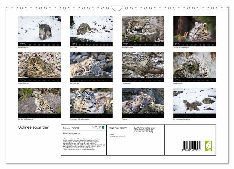 QUALITÄT - Hochwertiger Fotokalender mit 12 wunderschönen Motiven auf lichtbeständigem Bilderdruckpapier, robuste Spiralbindung mit Aufhängebügel.NACHHALTIG - deutliche Abfallreduzierung durch bedarfsgerechte Einzelstückfertigung, umweltfreundliches FSC-zertifiziertes Papier, Produktion in Deutschland, klimabewusste Logistik.PERFEKTES GESCHENK - Kalender für Freunde und Familie, für Kinder und Erwachsene, jung und alt, zu Weihnachten, Geburtstag oder zwischendurch.VIELFALT - Bildkalender in verschiedenen Formaten, z.B. DIN A5, DIN A4, DIN A3 sowie DIN A2. Ob Naturmotiv, Gemälde oder Fotos, ideal für ein persönliches Wohlfühlambiente.Wundervolle Fotografien vom Schneeleoparden. von Autor(in): Cloudtail the Snow Leopard