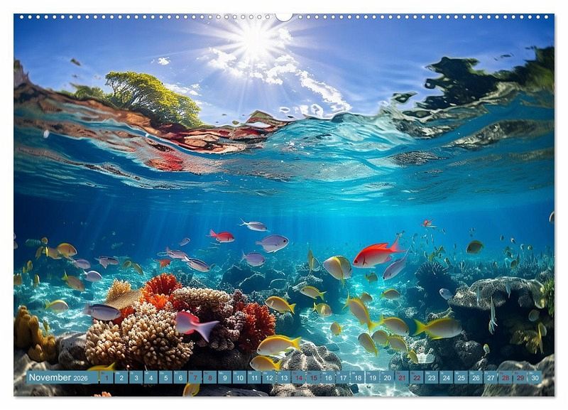Dieser Kalender nimmt Sie mit auf eine bezaubernde Reise in die flachen Stellen der Ozeane mit Urlaubsfeeling. Tauchen Sie ein in eine Welt voller Farben, Muster und faszinierender Kreaturen, während Sie sich inspirieren lassen, diese Unterwasserparadiese mal selbst zu erkunden