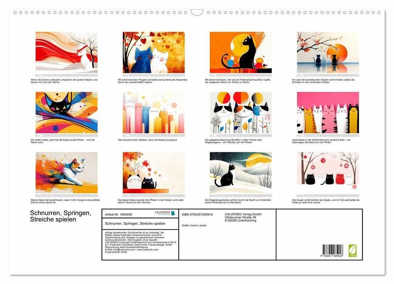 Stell dir eine Welt vor, in der Katzen nicht einfach nur grau oder getigert sind - sondern in den schillerndsten Farben leuchten! Jede Illustration erzählt eine eigene zauberhafte Geschichte: Regenbogenkatzen, die Träume malen, funkelnde Sternenpfoten, die durch den Nachthimmel schleichen, und magische Samtpfoten, die mit jedem Schritt ein kleines Wunder hinterlassen. Tauche ein in diese fantasievolle Bilderwelt und lass dich von Farben, Formen und flauschiger Magie verzaubern! Perfekt für alle, die Katzen lieben - und das Leben ein bisschen bunter sehen wollen! Alle hier gezeigten Bilder wurden mit Sorgfalt, Liebe und mit Hilfe einer KI generiert. Abschließend werden sie mit Bildbearbeitungsprogrammen überarbeitet und in den Kalender eingefügt.