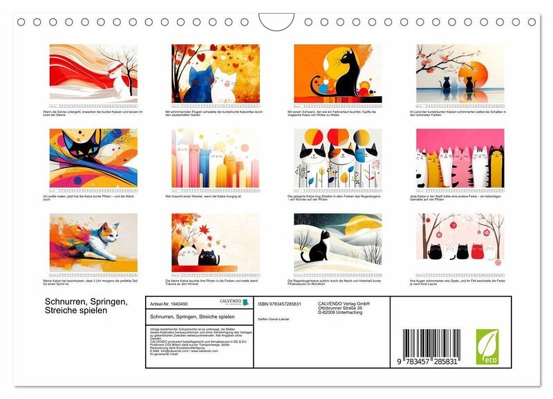 QUALITÄT - Hochwertiger Fotokalender mit 12 wunderschönen Motiven auf lichtbeständigem Bilderdruckpapier, robuste Spiralbindung mit Aufhängebügel.NACHHALTIG - deutliche Abfallreduzierung durch bedarfsgerechte Einzelstückfertigung, umweltfreundliches FSC-zertifiziertes Papier, Produktion in Deutschland, klimabewusste Logistik.PERFEKTES GESCHENK - Kalender für Freunde und Familie, für Kinder und Erwachsene, jung und alt, zu Weihnachten, Geburtstag oder zwischendurch.VIELFALT - Bildkalender in verschiedenen Formaten, z.B. DIN A5, DIN A4, DIN A3 sowie DIN A2. Ob Naturmotiv, Gemälde oder Fotos, ideal für ein persönliches Wohlfühlambiente.Tauche ein in eine Welt voller Farben, Fantasie und flauschiger Wunder! Diese einzigartigen Illustrationen zeigen Katzen in allen erdenklichen Farbtönen. von Autor(in): Steffen Gierok ; Magik Artist Design