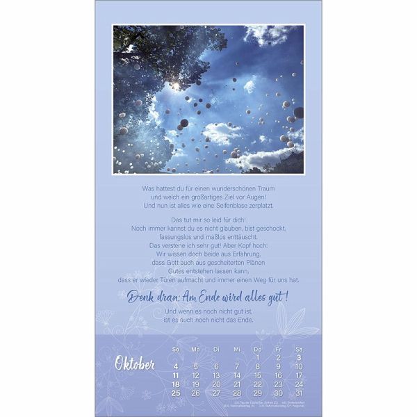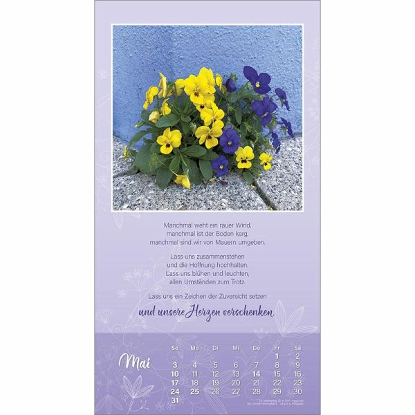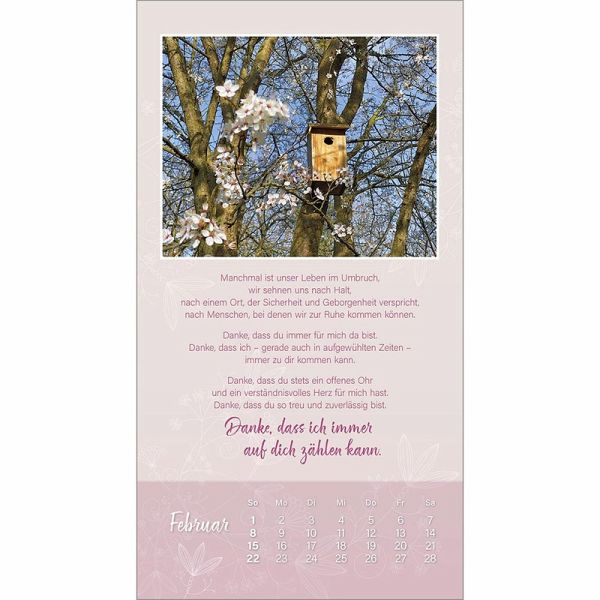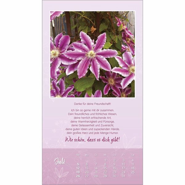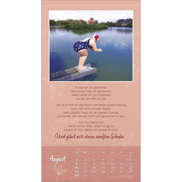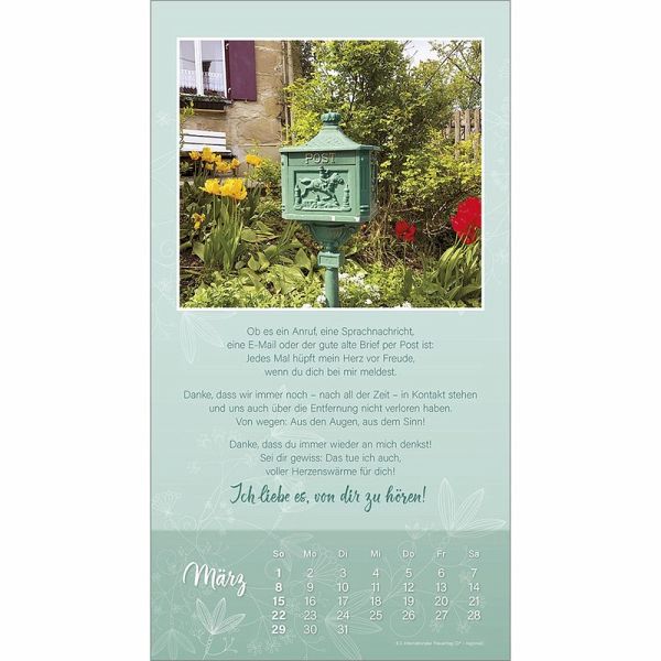 Der "Ich mag dich"-Wandkalender von Doro ZachmannWOHLTUEND - HERZLICH - FREUNDSCHAFTLICHMit diesem Kalender sagt man lieben Menschen ein "Ich mag dich" und zeigt damit ein ganzes Jahr lang eine herzliche Verbundenheit.Die persönlichen Texte von Doro Zachmann sprechen jeder Freundschaft aus der Seele. Ihre Bilder verbreiten eine wohltuende Heiterkeit.Wand-Kalender:- mit christlichen Texten von Doro Zachmann- mit "freundschaftlichen" Motiven- Schutzlack- Spiralbindung