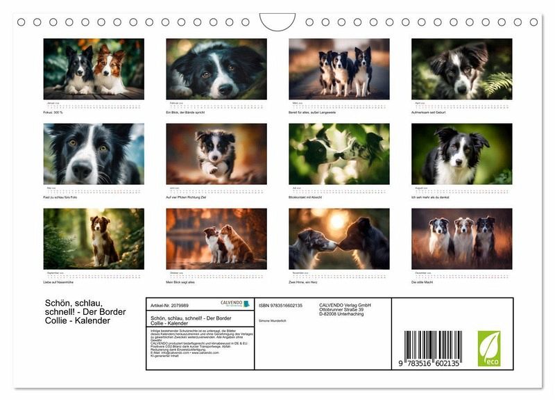 QUALITÄT - Hochwertiger Fotokalender mit 12 wunderschönen Motiven auf lichtbeständigem Bilderdruckpapier, robuste Spiralbindung mit Aufhängebügel.NACHHALTIG - deutliche Abfallreduzierung durch bedarfsgerechte Einzelstückfertigung, umweltfreundliches FSC-zertifiziertes Papier, Produktion in Deutschland, klimabewusste Logistik.PERFEKTES GESCHENK - Kalender für Freunde und Familie, für Kinder und Erwachsene, jung und alt, zu Weihnachten, Geburtstag oder zwischendurch.VIELFALT - Bildkalender in verschiedenen Formaten, z.B. DIN A5, DIN A4, DIN A3 sowie DIN A2. Ob Naturmotiv, Gemälde oder Fotos, ideal für ein persönliches Wohlfühlambiente.Border Collies: Geniale Pfoten und kluge Köpfe! von Autor(in): Simone Wunderlich