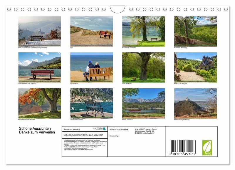 QUALITÄT - Hochwertiger Fotokalender mit 12 wunderschönen Motiven auf lichtbeständigem Bilderdruckpapier, robuste Spiralbindung mit Aufhängebügel.NACHHALTIG - deutliche Abfallreduzierung durch bedarfsgerechte Einzelstückfertigung, umweltfreundliches FSC-zertifiziertes Papier, Produktion in Deutschland, klimabewusste Logistik.PERFEKTES GESCHENK - Kalender für Freunde und Familie, für Kinder und Erwachsene, jung und alt, zu Weihnachten, Geburtstag oder zwischendurch.VIELFALT - Bildkalender in verschiedenen Formaten, z.B. DIN A5, DIN A4, DIN A3 sowie DIN A2. Ob Naturmotiv, Gemälde oder Fotos, ideal für ein persönliches Wohlfühlambiente.Bänke mit schönen Aussichten, die zum Verweilen und Entspannen einladen von Autor(in): Christine Wirges