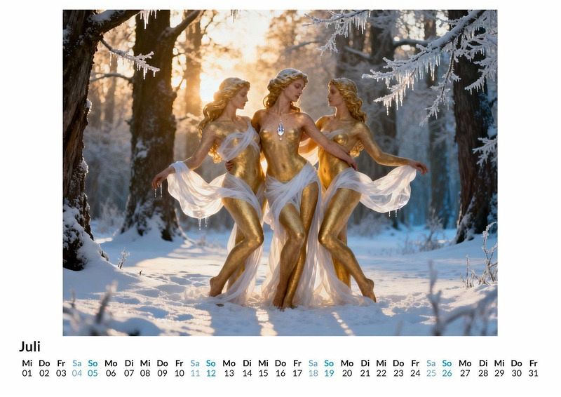 Eine Hommage an die weibliche Anmut und Stärke, eingefangen in zwölf einzigartigen Momenten. Der Kalender "Schöne Göttinnen" präsentiert eine Reise durch ein Jahr voller sinnlicher Ästhetik. Jeder Monat offenbart eine neue Facette der Schönheit, die sowohl kraftvoll als auch verletzlich erscheint und den Betrachter in ihren Bann zieht. Dieser Kalender ist eine passende Wahl: Für Liebhaber ästhetischer und sinnlicher Fotografie. Für Sammler von Kalendern mit einem besonderen visuellen Konzept. Als Geschenk für Menschen mit einem Sinn für das Ausgefallene. Jedes Monatsblatt enthüllt eine neue Gestalt. Die Motive zeigen Frauen in erhabenen Posen, umhüllt von durchscheinenden Seidentüchern, die die Konturen des Körpers mehr andeuten als verbergen. Das Spiel von Licht und Schatten auf zarter Haut und fließendem Stoff schafft eine Atmosphäre voller Eleganz. Diese visionären Darstellungen wurden durch digitale Kreativität zum Leben erweckt und verbinden klassische Schönheit mit den Möglichkeiten moderner Bildgestaltung. Was der Kalender bietet: Zwölf Monatsmotive in einem einheitlichen, ästhetischen Stil. Ein übersichtliches Kalendarium für die Jahresplanung. Ein dekorativer Wandschmuck für private Räume oder das Büro. Dieser Kalender ist mehr als nur ein Zeitmesser. Er ist eine ganzjährige Ausstellung, die die Schönheit des Weiblichen zelebriert. Es lohnt sich, die einzelnen Monatsblätter zu entdecken und sich von ihrer Ausstrahlung durch das Jahr begleiten zu lassen.