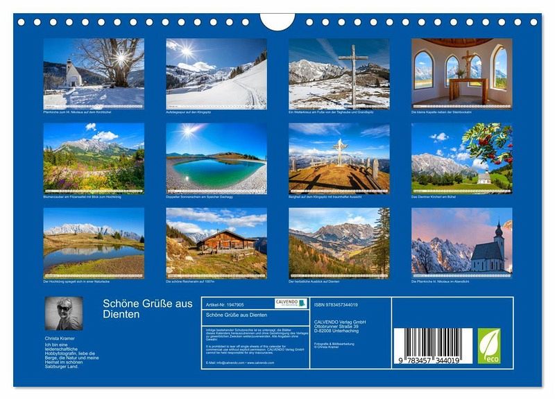 QUALITÄT - Hochwertiger Fotokalender mit 12 wunderschönen Motiven auf lichtbeständigem Bilderdruckpapier, robuste Spiralbindung mit Aufhängebügel.NACHHALTIG - deutliche Abfallreduzierung durch bedarfsgerechte Einzelstückfertigung, umweltfreundliches FSC-zertifiziertes Papier, Produktion in Deutschland, klimabewusste Logistik.PERFEKTES GESCHENK - Kalender für Freunde und Familie, für Kinder und Erwachsene, jung und alt, zu Weihnachten, Geburtstag oder zwischendurch.VIELFALT - Bildkalender in verschiedenen Formaten, z.B. DIN A5, DIN A4, DIN A3 sowie DIN A2. Ob Naturmotiv, Gemälde oder Fotos, ideal für ein persönliches Wohlfühlambiente.Beeindruckende Bilder aus Dienten am Hochkönig im Pinzgau von Autor(in): Christa Kramer