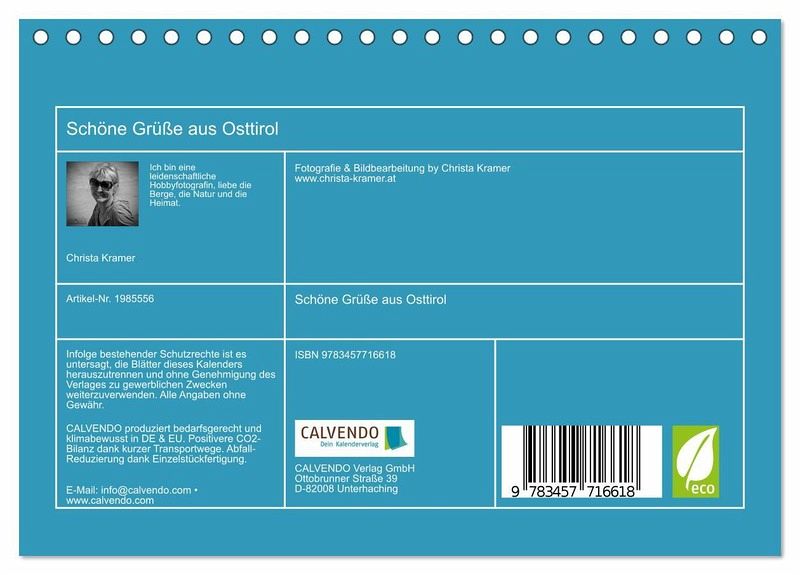 QUALITÄT - Hochwertiger Fotokalender mit 12 wunderschönen Motiven auf lichtbeständigem Bilderdruckpapier, robuste Spiralbindung.NACHHALTIG - deutliche Abfallreduzierung durch bedarfsgerechte Einzelstückfertigung, umweltfreundliches FSC-zertifiziertes Papier, Produktion in Deutschland, klimabewusste Logistik.PERFEKTES GESCHENK - Kalender für Freunde und Familie, für Kinder und Erwachsene, jung und alt, zu Weihnachten, Geburtstag oder zwischendurch.VIELFALT - Bildkalender in verschiedenen Formaten, z.B. DIN A5, DIN A4, DIN A3 sowie DIN A2. Ob Naturmotiv, Gemälde oder Fotos, ideal für ein persönliches Wohlfühlambiente.Impressionen einer faszinierenden Bergwelt mit Naturjuwelen aus Osttirol von Autor(in): Christa Kramer
